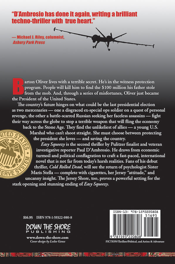 Easy Squeezy is the second thriller by Pulitzer finalist and veteran investigative reporter Paul D’Ambrosio. He draws from economic turmoil and political conflagration to craft a fast-paced, international novel that is not far from today’s harsh realities. Fans of his debut thriller, Cold Rolled Dead, will see the return of psychologist Sister Maris Stella — complete with cigarettes, her Jersey attitude, and uncanny insight. The Jersey Shore, too, proves a powerful setting for the stark opening and stunning ending of Easy Squeezy.