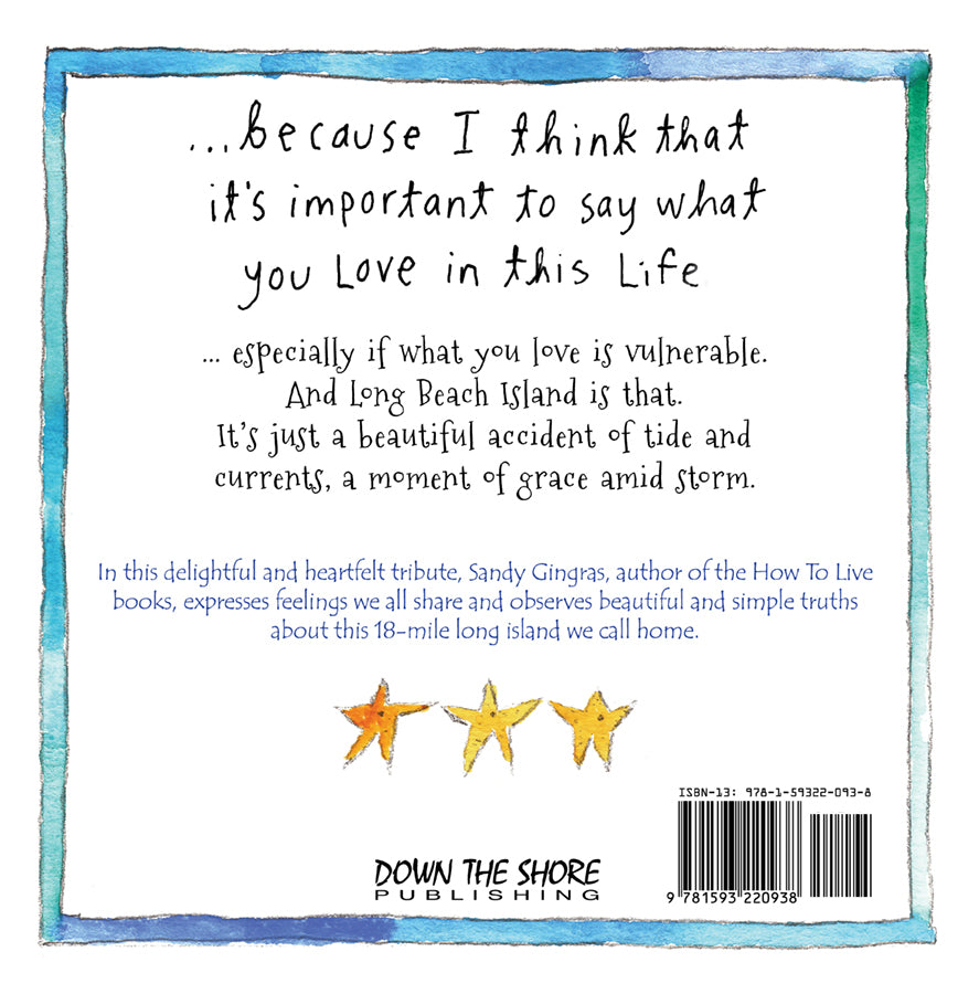 ''...Because I think it is important to say what you love in this life... especially if what you love is vulnerable. And Long Beach Island is that. It's just a beautiful accident of tide and currents, a moment of grace amid storm.'' In this delightful and heartfelt tribute, Sandy Gingras, author of the How To Live books, expresses the feelings we all share and observes beautiful and simple truths about this 18-mile long island we call home. — From the Inside Flap