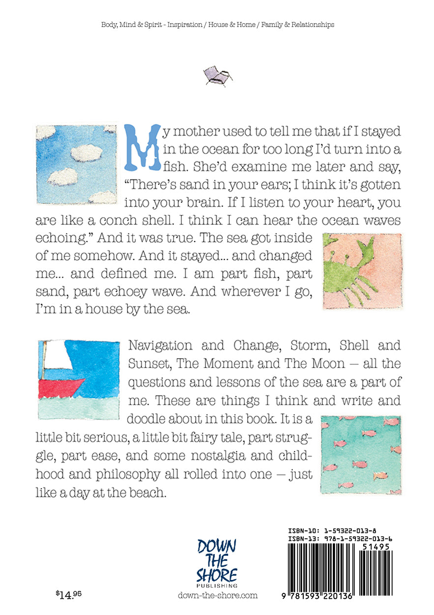 And it was true. The sea got inside of me somehow. And it stayed... and changed me... and defined me. I am part fish, part sand, part echoey wave. And wherever I go, I'm in a house by the sea. Navigation and Change, Storm, Shell and Sunset, The Moment and The Moon — all the questions and lessons of the sea are a part of me. These are things I think and write and doodle about in this book.