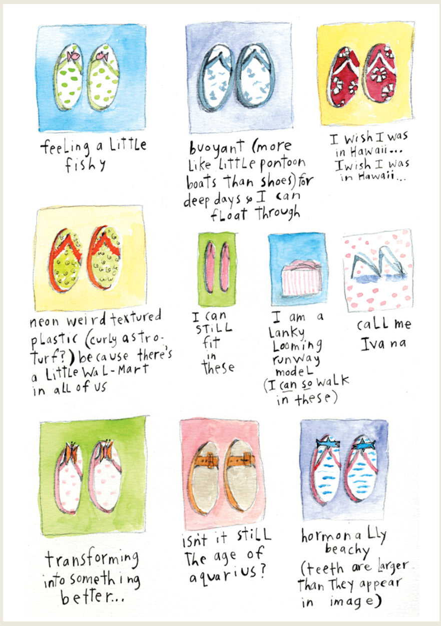 Gingras combines this eye for detail with gentle humor, as when she describes her neighbors barbecuing next door. There’s humor, too, in each page of whimsical drawings like "woman on vacation" or "flip flop moods" featuring the perennial beach footwear. In A House By The Sea is a mercurial sort of read, moving from humor and nostalgia to life lessons about change and acceptance and love. In a touching piece called "The Moon Is Sorry", she writes about the beach women, mothers and aunts, of her childhood. Did they, she wonders, ever get to just be or were they always taking care of someone – wrapping a shivering child in a beach towel, cooking corn and flounder for dinner?
