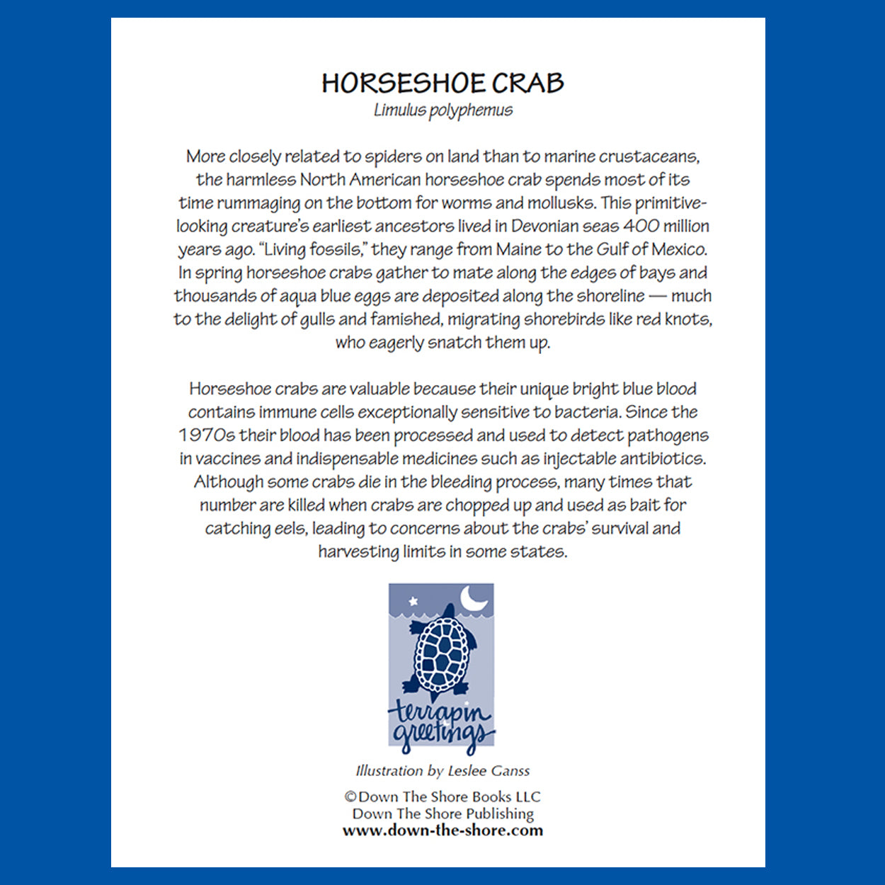 SeaNotes are notecards featuring illustrations of coastal bay and ocean animals by Leslee Ganss. Each set, Ocean and Bay, includes four cards with envelopes (4 designs, 1 of each.) For the Bay set: Great Blue Heron, Blue Crab, Diamondback Terrapin, and Horseshoe Crab). The cards also feature a fascinating natural history note that tells the intimate connection each of these species has with our coast.