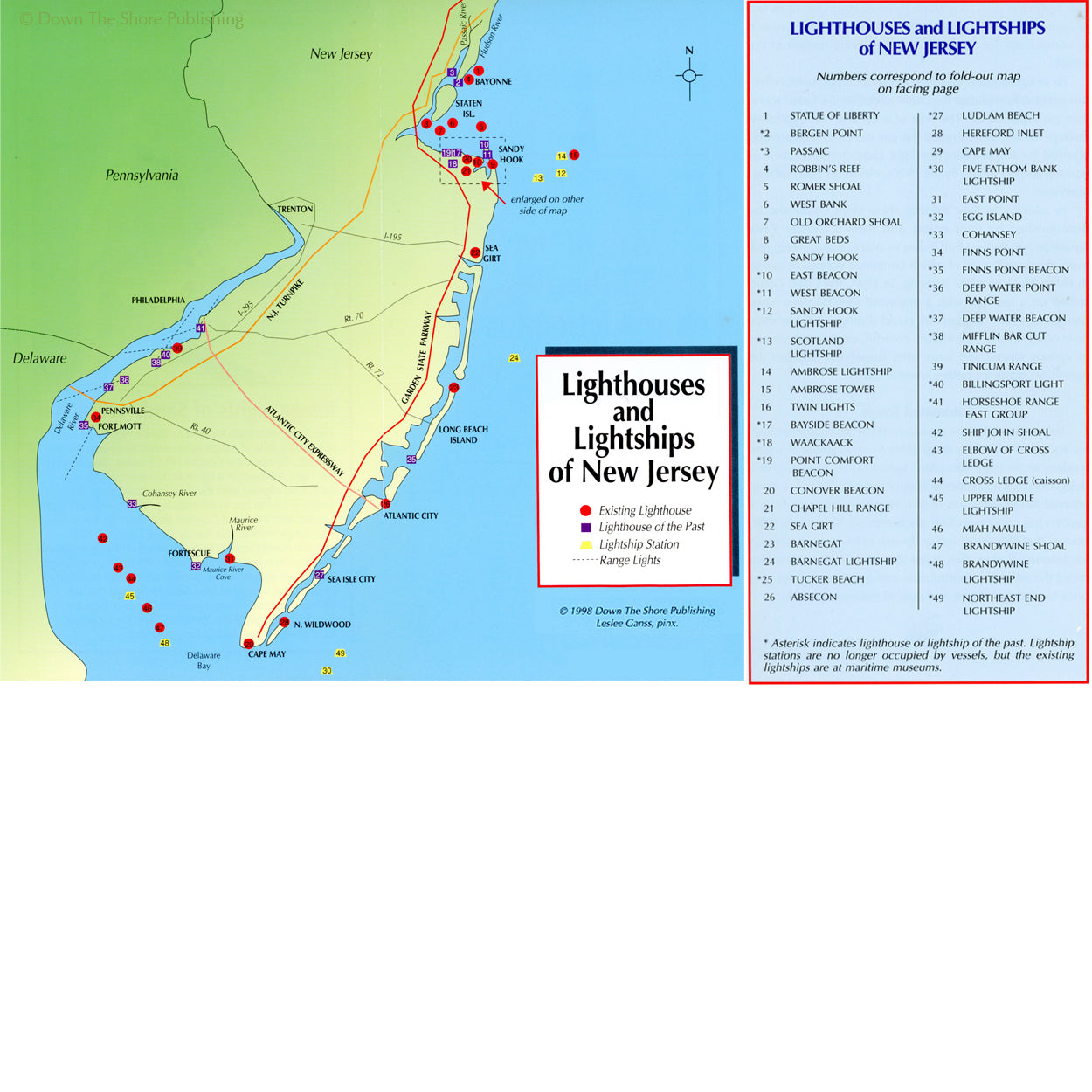 The book — which can be easily slipped into a large pocket or backpack — also includes a color fold-out map showing the locations of all past and present New Jersey lightstations, and a thorough lighthouse bibliography.