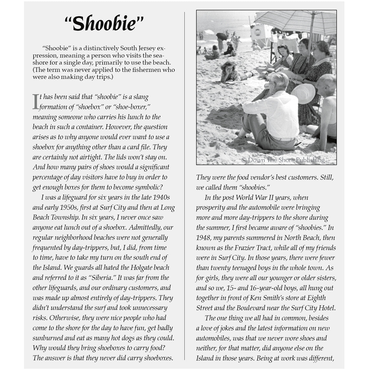(“Shoobie” is a distinctively South Jersey expression, meaning a person who visits the seashore for a single day, primarily to use the beach. The term was never applied to the fishermen who were also making day trips.)